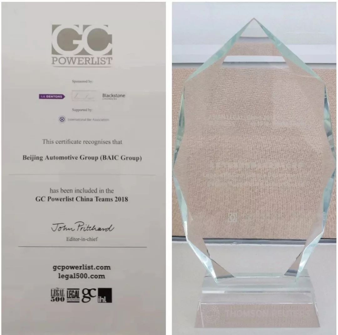 12月6日,2018 Legal 500法务强力榜单(2018 GC Powerlist China Teams)隆重发布,北汽集团荣登该榜单。12月18日,汤森路透旗下知名度最高、影响力最大的法律资讯供应商ALB(Asian Legal Business)公布了“中国TOP 15公司法务团队”大奖,北汽集团荣登该榜单。