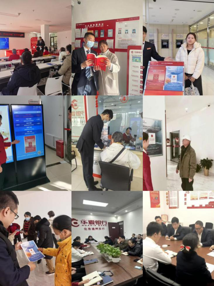 华夏银行及在京分行充分发挥基层触点延伸优势,以电子屏轮播宣传素材、摆放资料+员工现场讲解的方式打造“普法小课堂”,大堂经理化身“普法宣传员”,向客户发放宪法及金融法治宣传素材、解答法律咨询,将业务办理场景转化为普法现场。