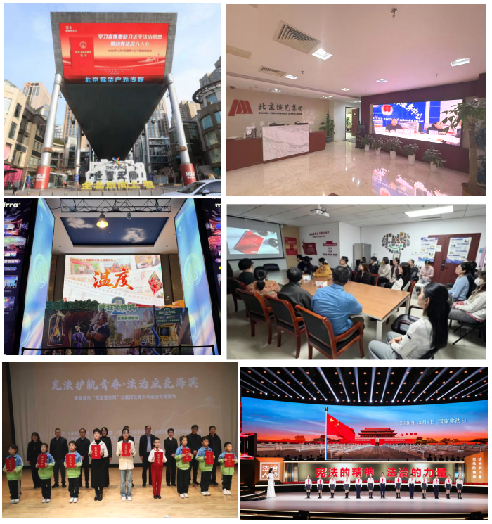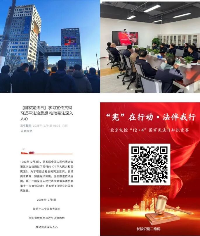 北京电控以“宪在行动·法伴我行”为主题组织总部职工参与“12·4国家宪法日知识竞赛”,各所属单位通过张贴海报、在户外大屏滚动播放北京市宪法宣传主题宣传片和普法网公益宣传片,确保宣传覆盖不留死角,推动宪法观念更加深入人心。