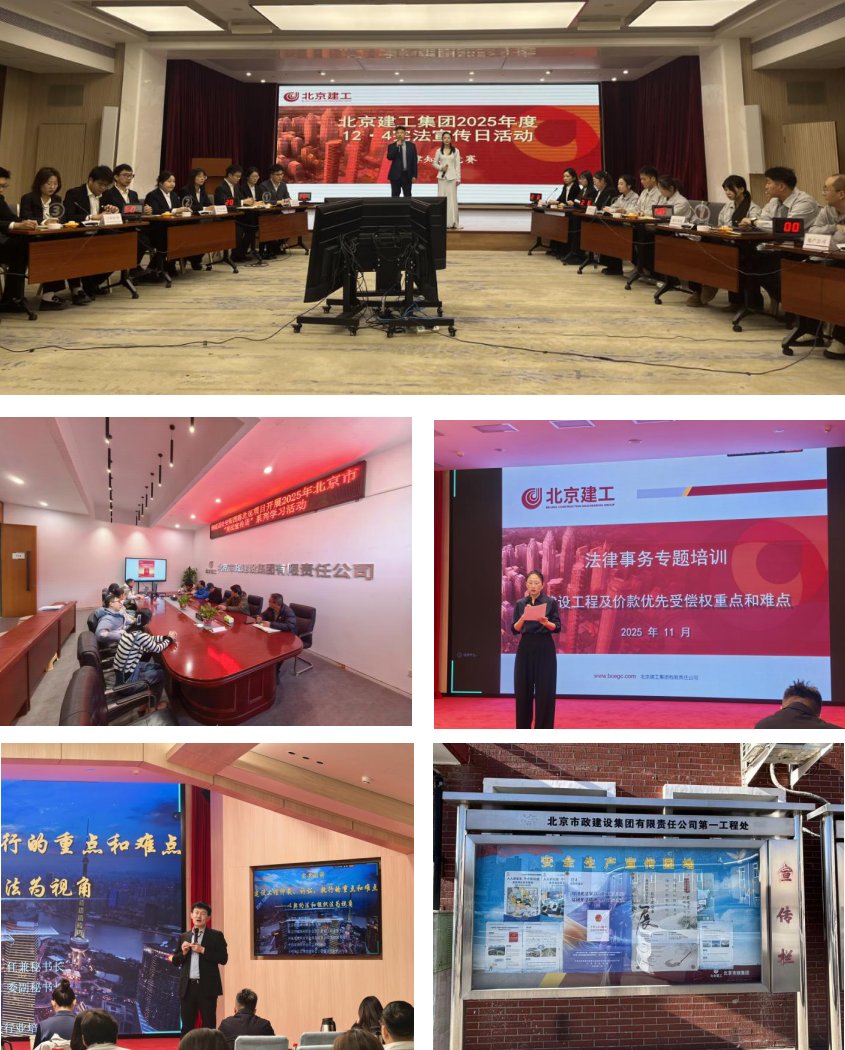 建工集团举办2025年宪法日法律知识竞赛决赛,以赛促学、以学促用;部分二级单位开展“普法进项目”专题活动;在办公场所、项目现场醒目位置张贴主题海报,营造“抬头见法、处处学法”的浓厚氛围。
