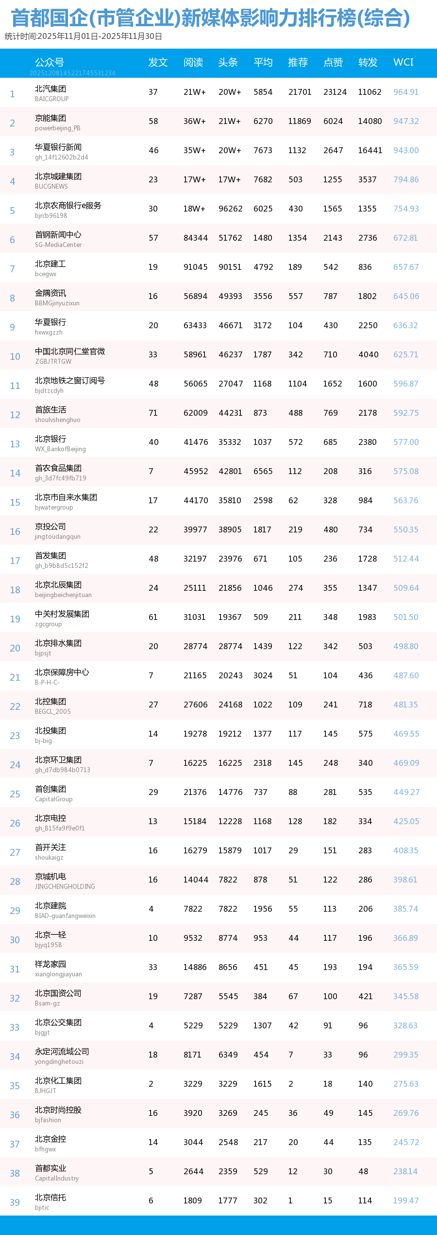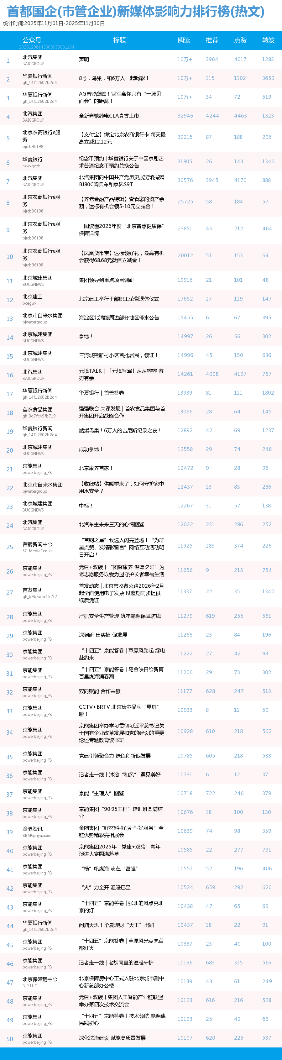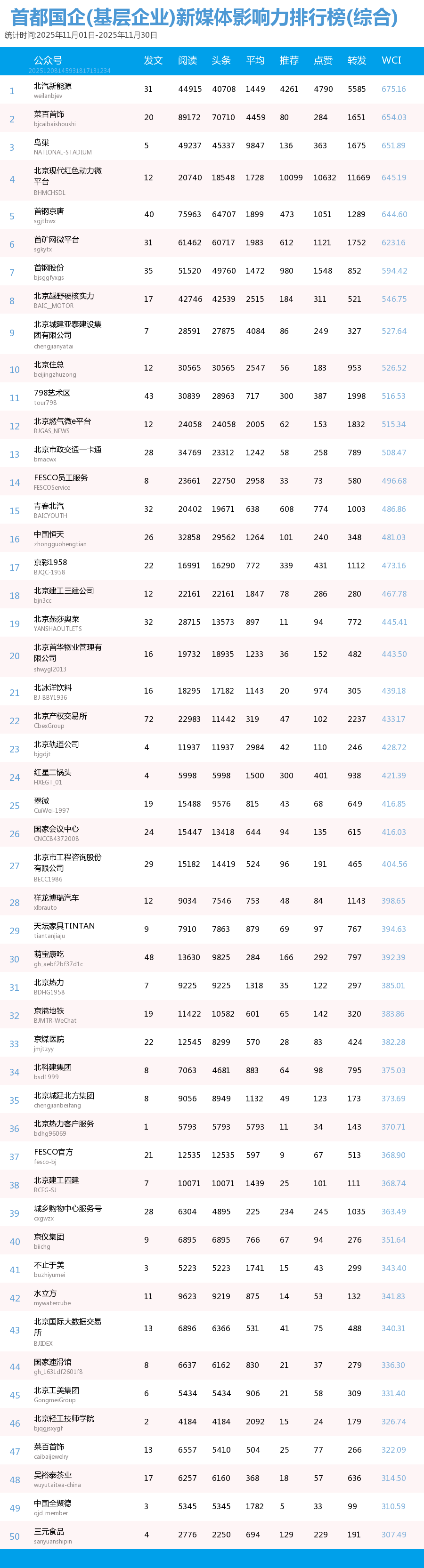 新时代开启新征程,新思想指引新作为。在融媒体风起云涌的互联网新时代背景下,新媒体的能量与地位日益彰显。为促进首都国企微信公众号之间的交流学习、多渠道同频共振,有效解读国资国企时政热点、及时报道改革发展生动实践,让微信朋友圈成为国资国企宣传的同心圆,京京于每月初发布首都国企新媒体影响力排行榜月榜(综合榜、热文榜),分别收集、分析市管企业、双管企业及所属子企业等市国资委新媒体账号的基础数据,对微信运营的实际绩效和影响力进行专业性考量。请大家疯狂打call,热切关注。