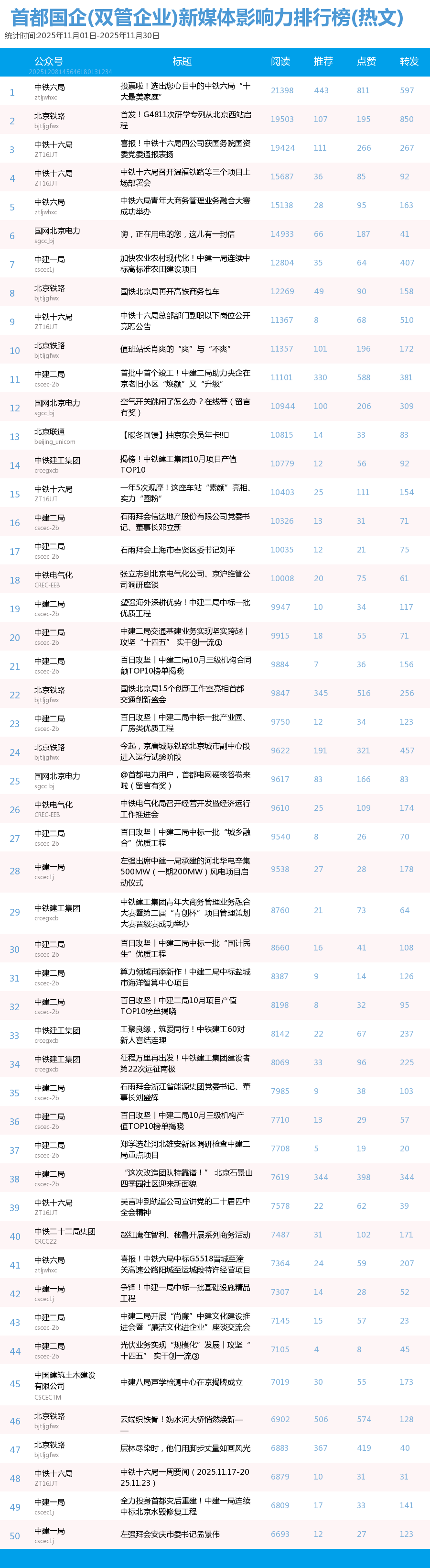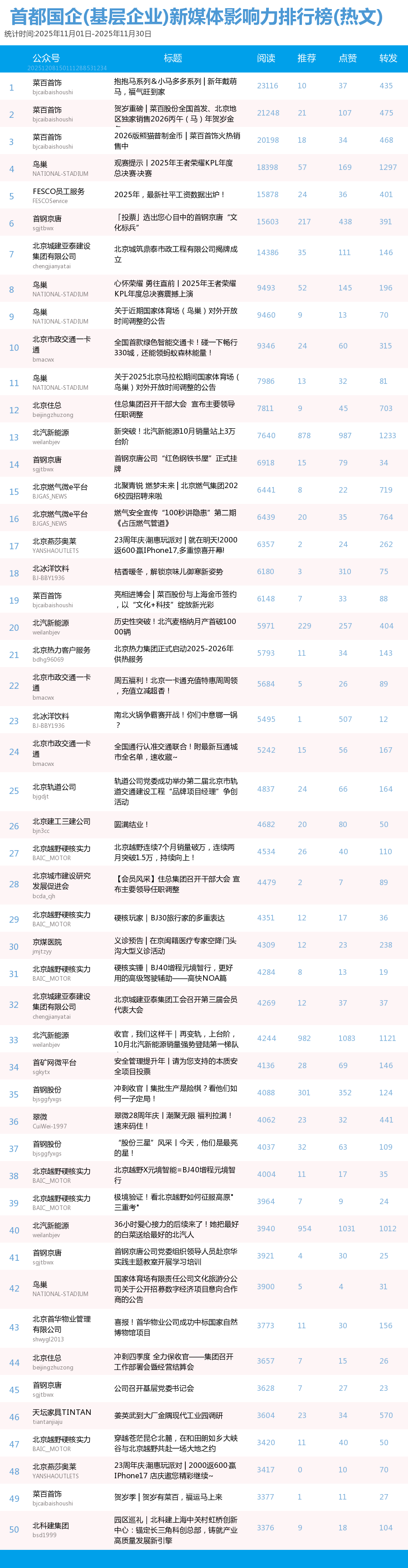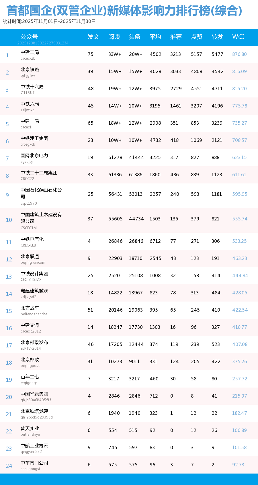 新时代开启新征程,新思想指引新作为。在融媒体风起云涌的互联网新时代背景下,新媒体的能量与地位日益彰显。为促进首都国企微信公众号之间的交流学习、多渠道同频共振,有效解读国资国企时政热点、及时报道改革发展生动实践,让微信朋友圈成为国资国企宣传的同心圆,京京于每月初发布首都国企新媒体影响力排行榜月榜(综合榜、热文榜),分别收集、分析市管企业、双管企业及所属子企业等市国资委新媒体账号的基础数据,对微信运营的实际绩效和影响力进行专业性考量。请大家疯狂打call,热切关注。